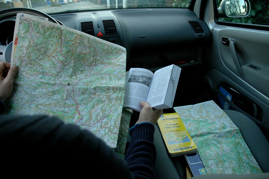 Letzte Zweifel sollte ich bei einem einwöchigen Praxistest ausräumen - unbezahlt, versteht sich. Um die Arbeitssituation perfekt zu simulieren, nahm mein Verleger auf der Rückbank meines Autos Platz, deponierte eine Landkarte und einen Reiseführer auf dem Beifahrersitz und los ging es. Zu seiner Begeisterung verstand ich es, einhändig zu lenken und gleichzeitig mit der anderen Hand die Landkarte auseinanderzufalten, während ich die von ihm genannten Ziele der Reihe nach ansteuerte. Die Heizung und das Gebläse liefen auf vollen Touren, ich schwitzte klaglos, denn ich wußte, mein Verleger wollte sich ganz sicher sein, dass ich für den provenzalischen Dauereinsatz unter Sonne und Mistral geeignet bin. Wir testeten meine Fähigkeiten auf der Autobahn, bei Nachtfahrten und auf kleinen verwinkelten Landstraßen - es gab nichts zu mäkeln. Selbst Serpentinen meisterte ich mit Bravour und referierte währenddessen über die kulturhistorische Bedeutung keltischer Oppida für die europäische Zivilisation. Letzteres interessierte meinen Verleger in diesem Moment herzlich wenig, doch als er merkte, dass ich ohne anzuhalten, nicht nur essen und trinken, sondern auch einen Text auf seine inhaltliche Richtigkeit überprüfen und Karten korrigieren konnte, sah ich im Rückspiegel, wie er sich vor Freude über seinen zukünftigen Autor genussvoll die Hände rieb.
